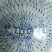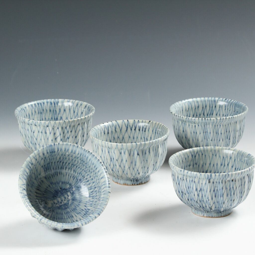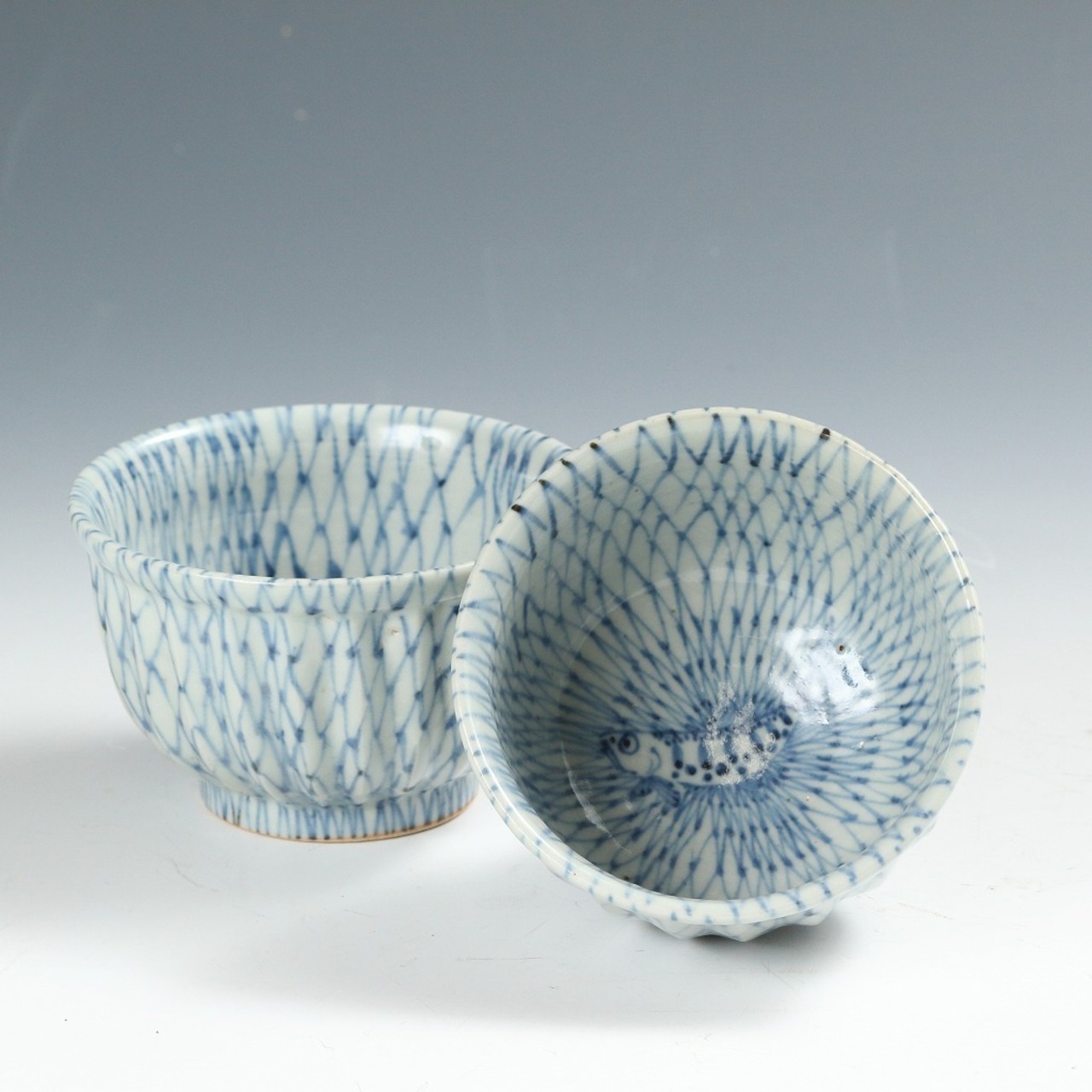 お買い得食器 在銘;「紫」手描き染付 網手川魚文 向付/ 汲出1客 小服茶碗にも dbsy15921-ミ5