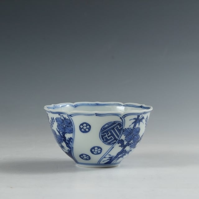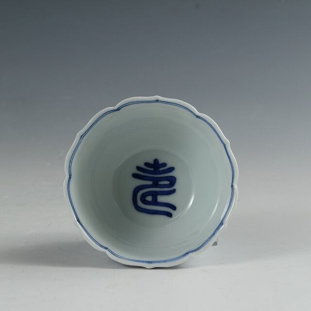 染付で描かれた捻文には三友(松竹梅)と丸文、見込みには寿の文字が染付された、おめでたい、輪花口の向付。大きさも一番使いやすいサイズです